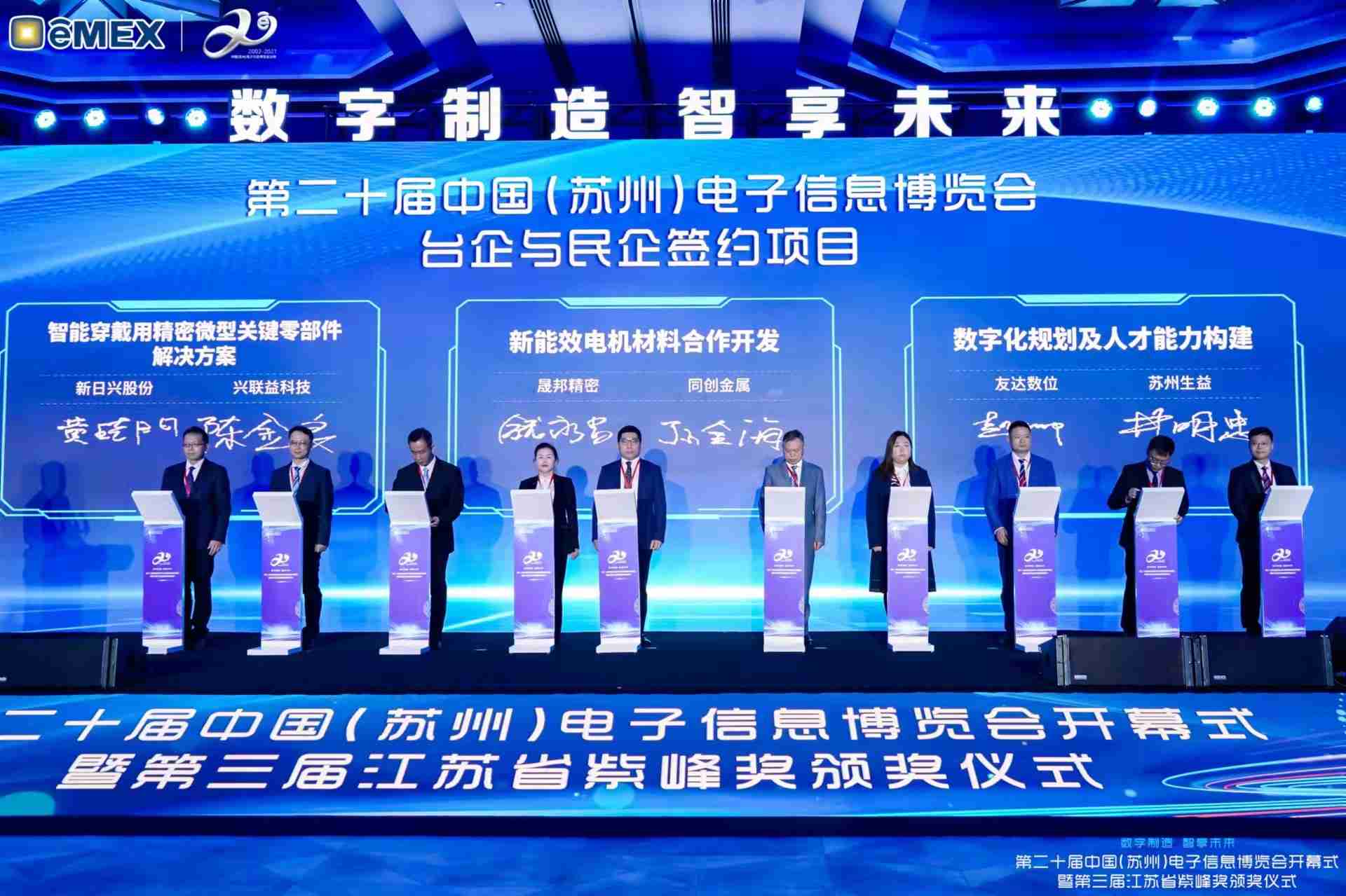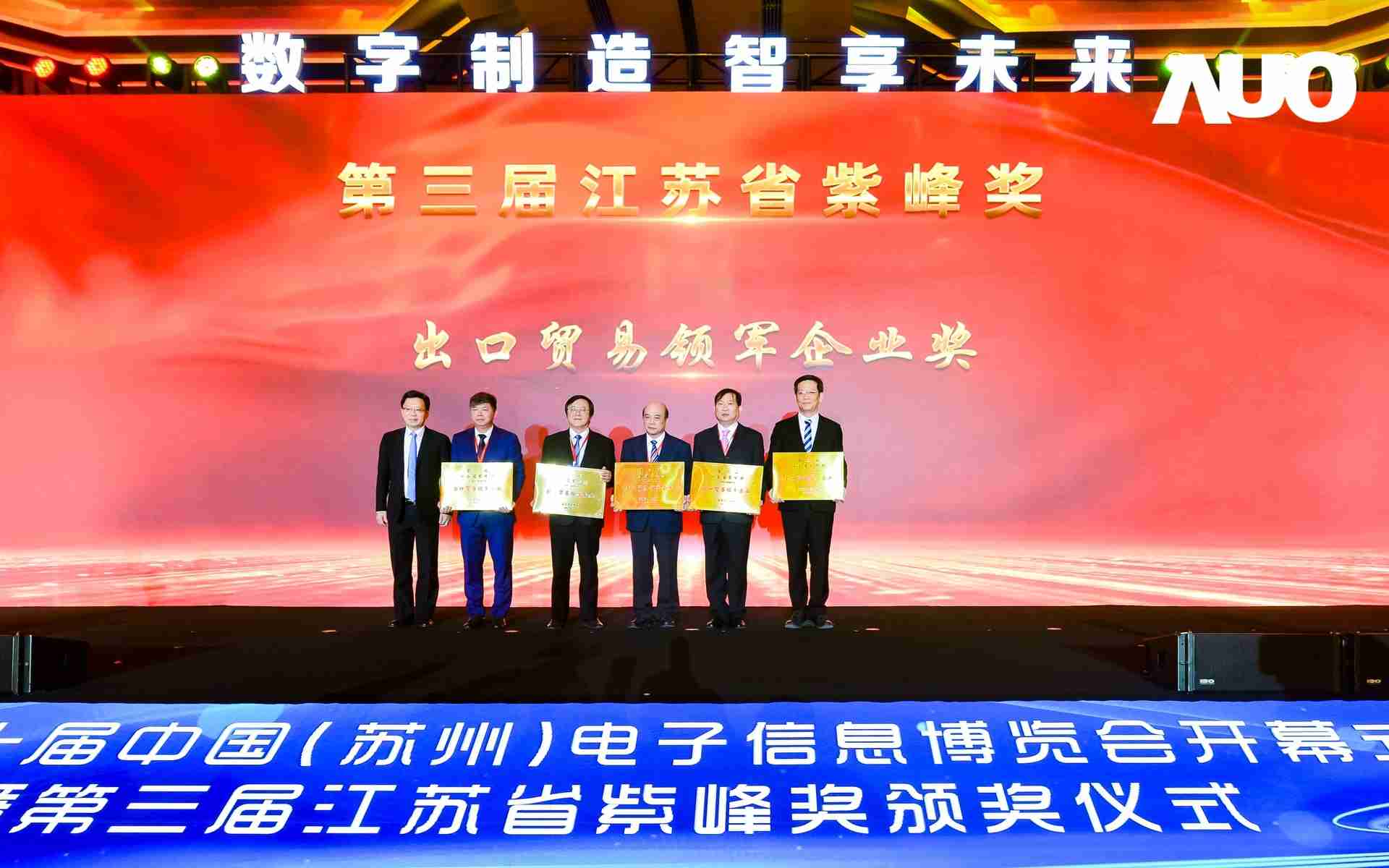 电博会开幕式当天也是第三届江苏省紫峰奖颁奖仪式,,,,省台办、、、、工信厅、、、商务厅、、、苏州市相关领导均出席并颁奖。。。。该奖项为表彰对江苏高质量发展做出积极贡献的在苏企业,,由江苏省政府专门设立。。。欧陆注册光电 (苏州) 总经理郭振明代表上台领奖,,,,这也是欧陆注册苏州连续三次蝉联紫峰奖 出口贸易领军企业奖。。。。欧陆注册数位总经理赵丽娜女士,,,,也参与本次开幕式,,上台为本地化赋能签署战略合作协议,,,将优质服务资源集合、、、下沉到更多细分行业,,,为更多地区的制造企业提供数字化转型服务。。。。