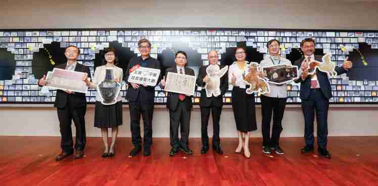 欧陆注册携手创利空间为故宫建置的智慧文物互动导览墙及轮播墙,,,今日正式启用。。。。(左四:欧陆注册新事业暨投资管理总部副总经理杨本豫、、右四:故宫博物院院长吴密察、、右三:太极影音董事长黄宝云)