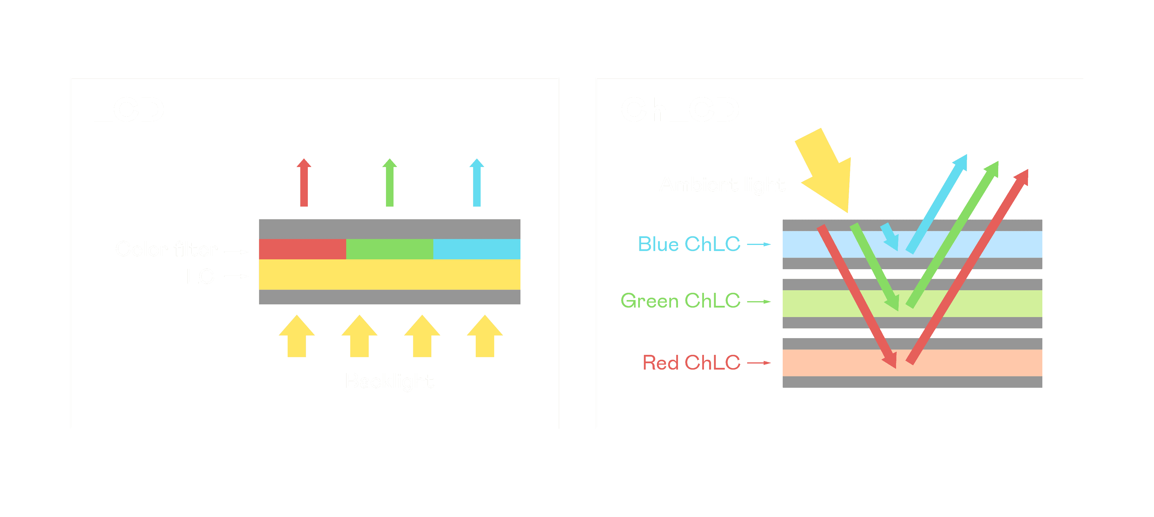 ChLCD 胆固醇液晶就如同纸张一样,,透过反射环境光来显示影像,,因此长时间观看不易造成人眼视觉疲劳,,可达到护眼效果。。当处于户外阳光下使用,,,LCD 影像容易失真而不易观看,,,但胆固醇液晶仍可维持较佳的影像品质。。