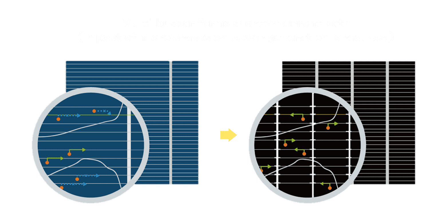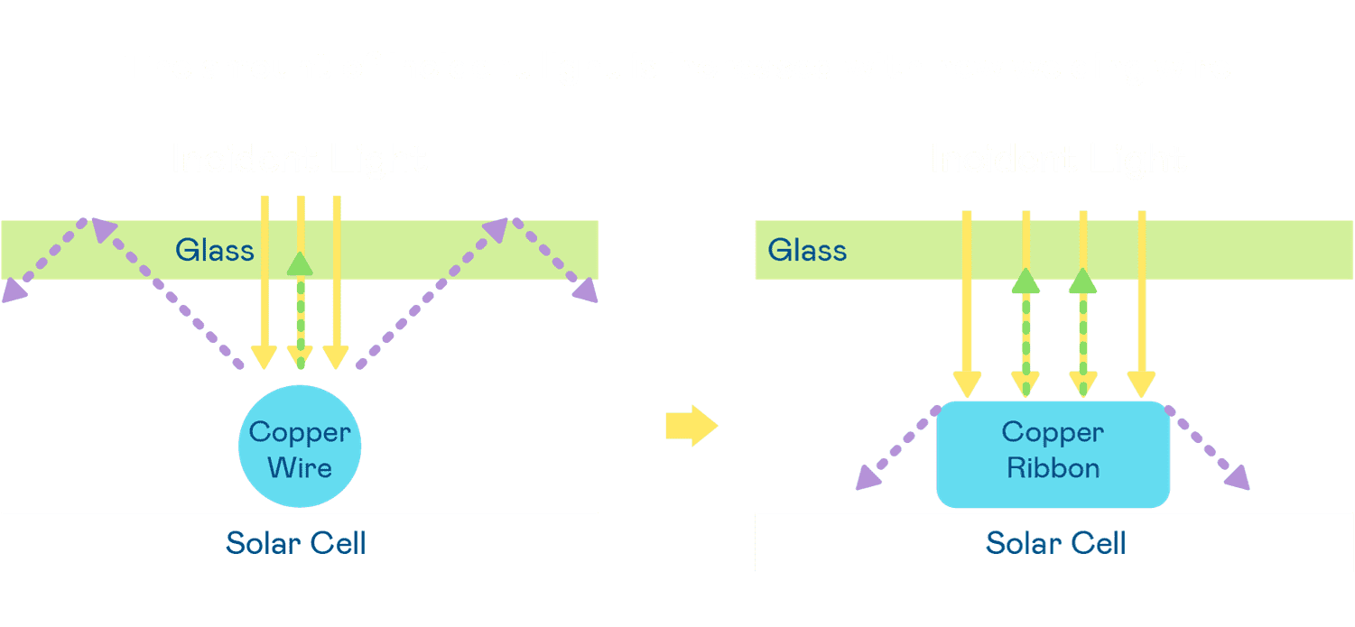 - 电池使用多条铜导线 (Copper wire) 于电池片上形成较短的电流路径,,,,提高电流收集效率,,,采用圆形设计的铜导线较传统扁平式的铜焊带 (Ribbon),,,可增加入射至电池的光线量。。。。