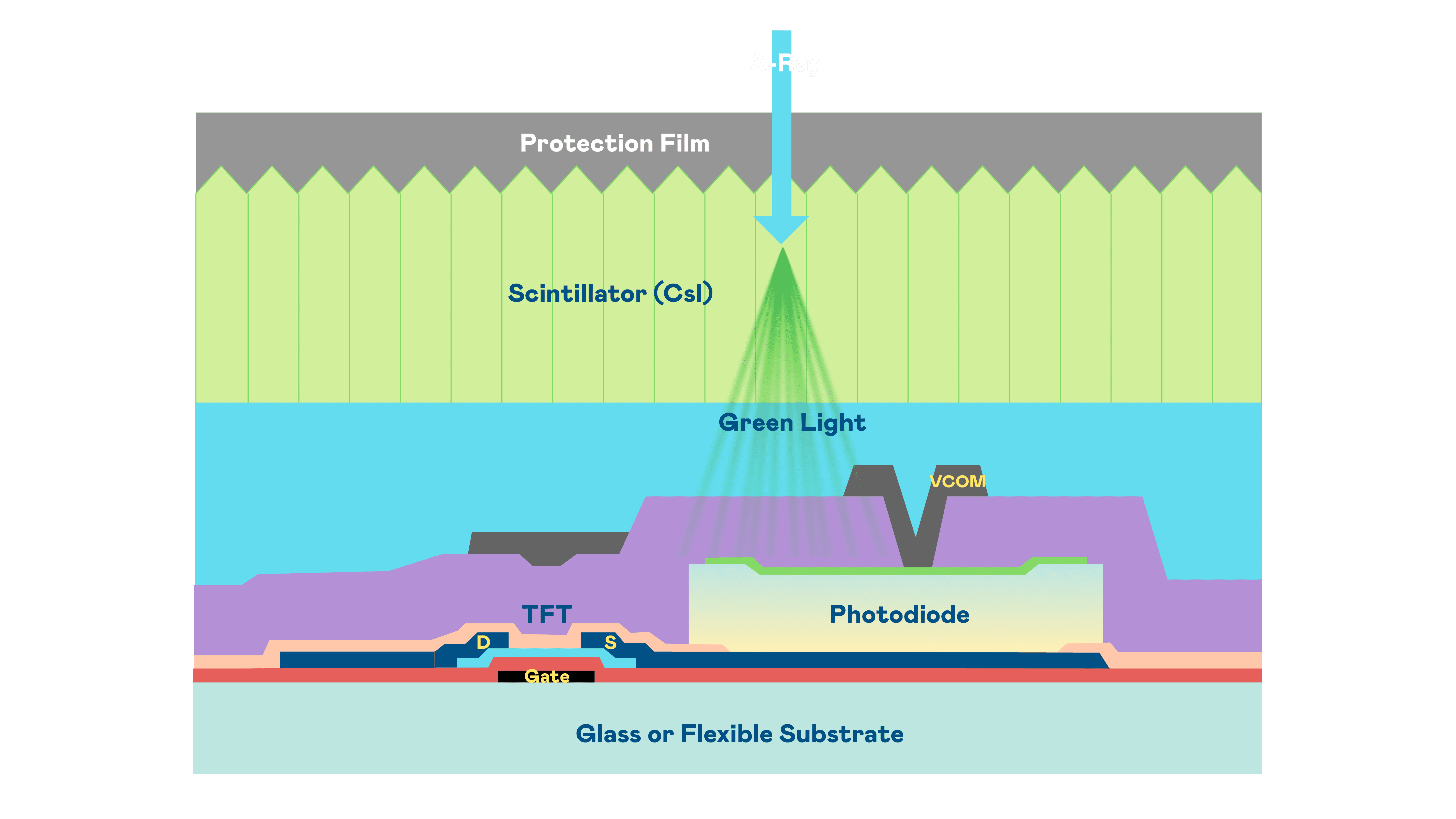 欧陆注册的X光影像感测阵列使用薄膜电晶体 (TFT) 作为每个像素的读取开关,,,,搭配光电二极体(Photodiode)的光电转换元件,,,,用以感测X光影像讯号。。。