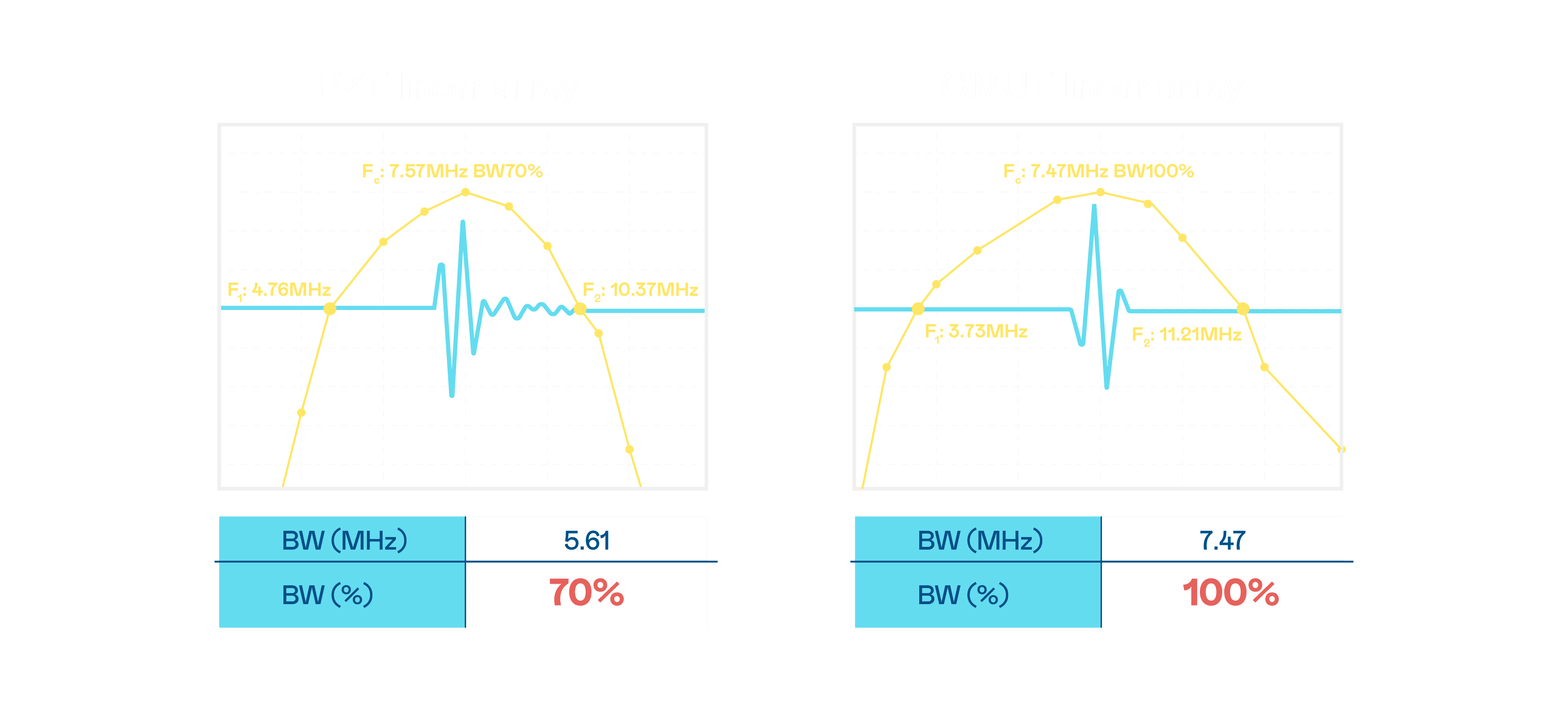 超音波影像的解析度高低,,,首先取决于探头能发出的讯号频宽。。。欧陆注册 CMUT 可提供高清晰的超音波讯号,,,提供高频宽、、、、高灵敏度、、、影像纹理细节更高的超音波影像,,,,协助医护人员缩短影像判读时间及利用精准的医疗影像进行诊断。。。